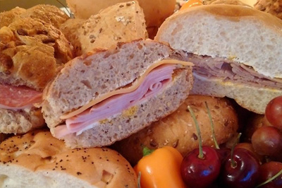 Freshly baked bread sandwich (ham & cheese, roast beef, smoke meat, or turkey breast) with a side macaroni or potato salad, side of St-Albert cheese or side soup, and dessert. - $25