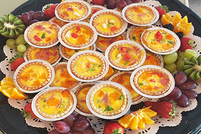 One meat choice (sausage, bacon or ham), breakfast potatoes, scrambled eggs or boiled eggs (or substitute choice of eggs for pancakes or french toast), two pastries of your choice, fruit platter - $26 per plate.