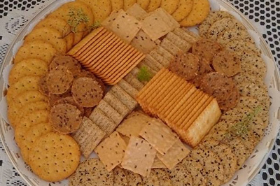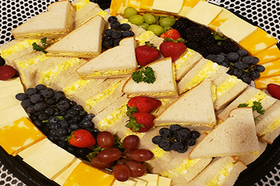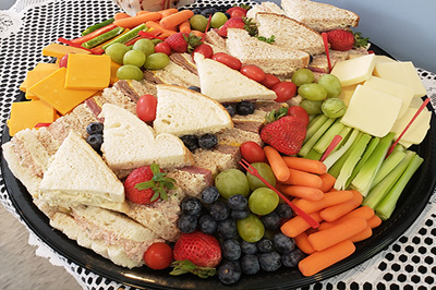 St-Albert cheese, assorted tea sandwiches, fancy bun sandwiches, pickles, fancy crackers, two salads of your choice - $24 per plate.